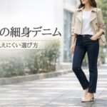 幼く見えにくいスキニーデニムは、「濃い色」「もたつかない丈」「張りつきすぎない細さ」で見極めると判断しやすいです。この3点が整っていれば、30代らしい落ち着きとすっきり感を両立しやすくなります。流行だけで選ぶより、自分の足元やトップスにつなげたときに自然に見えるかを基準にすると、長く使いやすい一本に出会いやすいと思います。