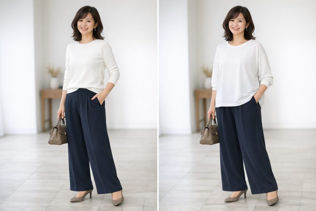 まず意識したいのは、パンツそのものの形です。ワイドパンツは幅が広すぎると迫力が出やすく、腰まわりまで大きく見えることがあります。40代がきれいめに履きやすいのは、腰まわりはすっきりしていて、ひざ下から自然に落ちるワイドシルエットです。