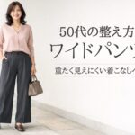 ワイドパンツは体の線を拾いにくく、50代にも取り入れやすいボトムです。だからこそ、ただゆるく履くのではなく、「どこをすっきり見せるか」を決めて選ぶことが、重たく見えにくい着こなしにつながります。
