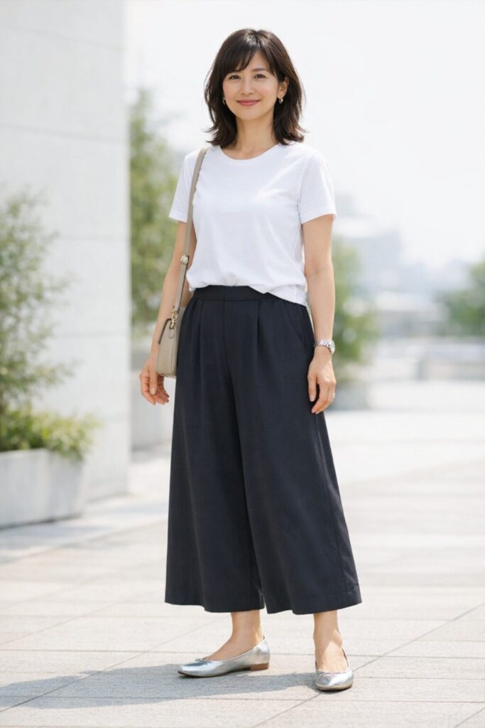 黒ガウチョパンツは合わせやすい反面、なんとなく下半身が重く見えてしまうことがありますよね。そんなときは黒をやめるのではなく、丈感・上半身との比率・足元の軽さを見直すと、印象はかなり整いやすくなります。