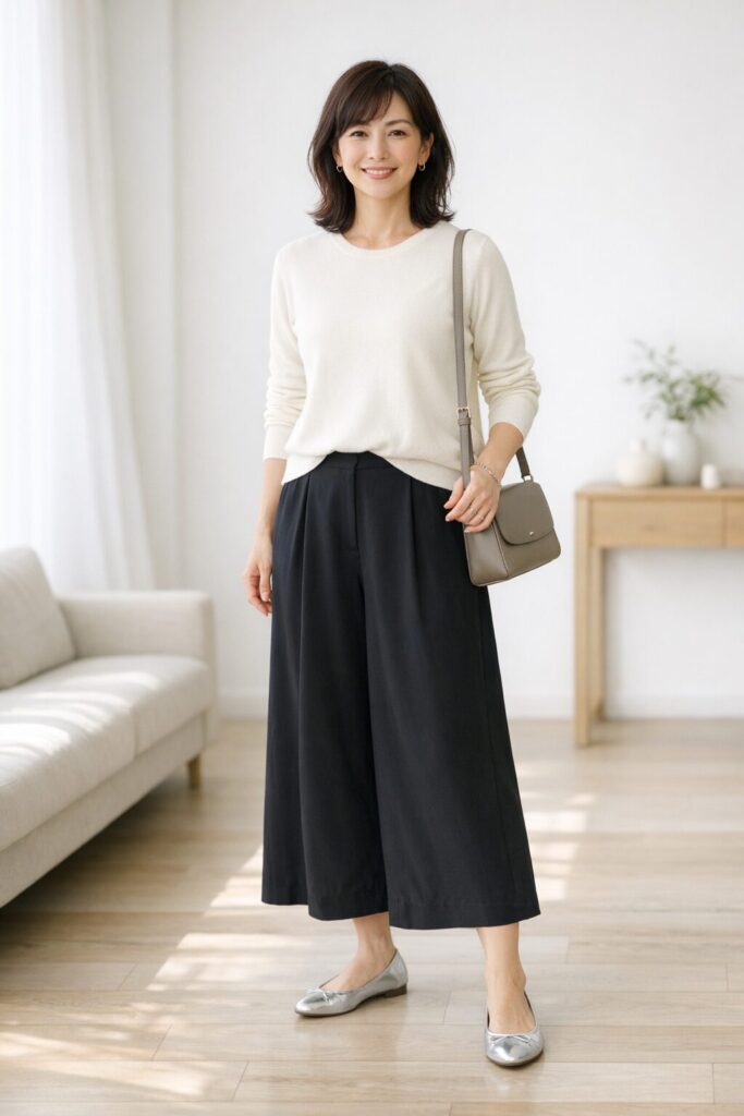 たとえばライトグレーの薄手ニットに、足元はシルバーの細身バレエシューズ、バッグはトープの小さめショルダーにすると、黒ガウチョでも軽さが出しやすいです。