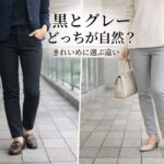 黒を選ぶなら、重たさを避けるために、くるぶしが少し見える丈と、甲が浅めのパンプスや細身ローファーを合わせると全身が軽く見えやすくなります。グレーを選ぶなら、ぼやけすぎないように、トップスか靴のどこかに少し締まりを作るとまとまりやすいです。