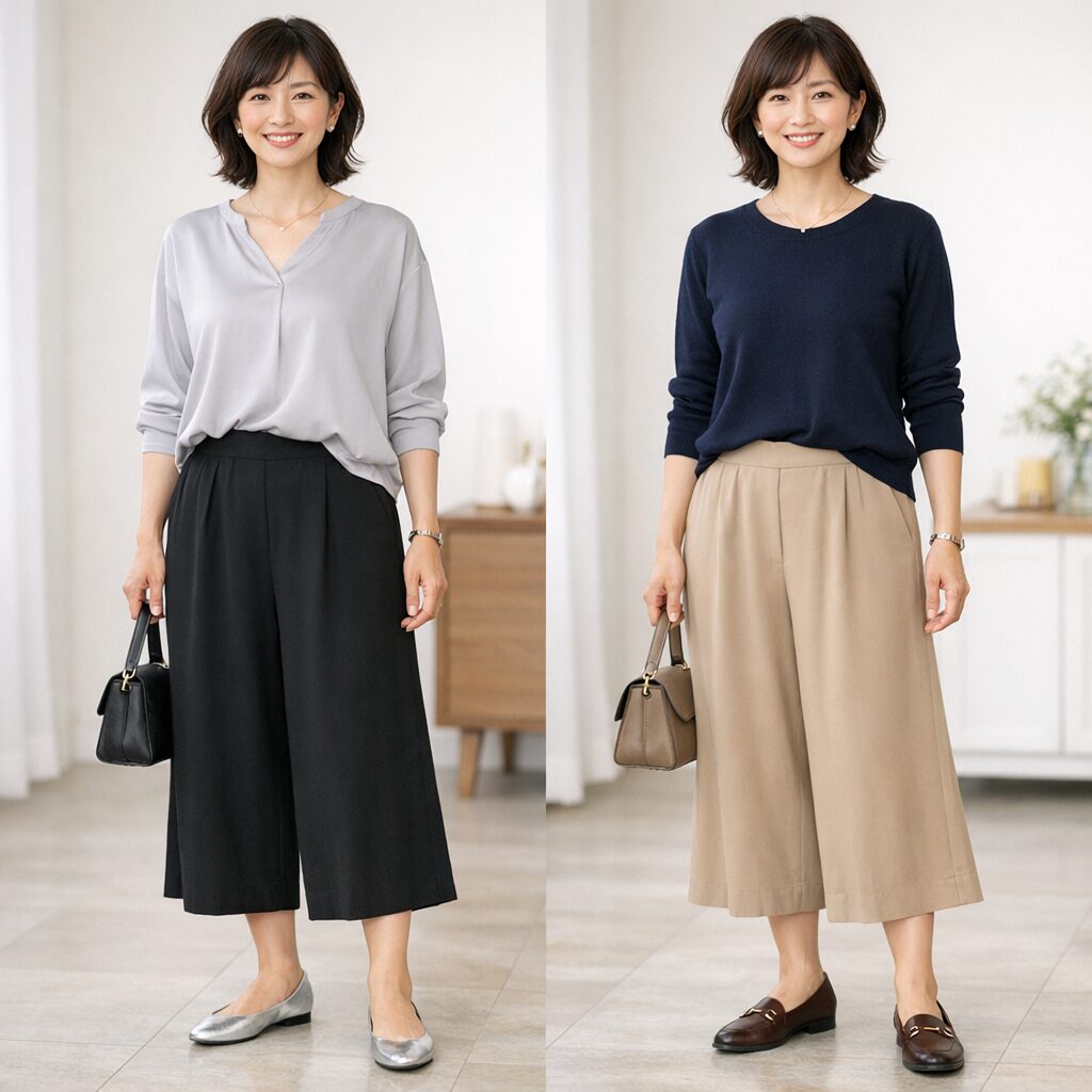 そこで今回は、黒とベージュのガウチョパンツを比較しながら、どんな人にどちらが合いやすいのかを整理していきます。