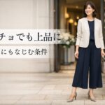 ジャケット・パンプス・小ぶりバッグまでそろえると、ガウチョパンツでも落ち着いた式典向けの印象に寄せやすくなります。
