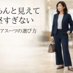 フレアパンツスーツは、きちんと感が出しやすい反面、素材や色、インナーの組み合わせによっては入学式や行事のような印象に寄りやすくなります。通勤や少しかしこまった場にも使いたい大人女性は、華やかさを足すよりも、“整って見えるけれど日常にも浮きにくい”バランスを意識して選ぶのが近道だと思います。