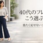 フレアパンツそのものが痛く見えるわけではなく、広がり方や丈感、合わせるトップスとのバランスが今の自分に合っていないと、少し浮いて見えやすくなります。40代は、甘さよりも縦の流れと落ち着きが出る選び方を意識すると、大人っぽく整いやすいと思います。
