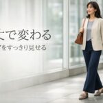 たとえば、ダークネイビーのフレアパンツに、ライトグレーのややハリのある比翼ブラウス、アイボリー寄りベージュのノーカラージャケットを合わせると、上半身に明るさが出て重たさを抑えやすくなります。足元はトープの甲深すぎないビットローファーにすると、知的さを保ちながら裾の流れもきれいにつながります。