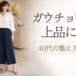 40代のガウチョパンツは、選び方しだいできれいめに十分寄せられます。落ち感・幅感・丈感の3つを先に確認してから探すと、失敗しにくくなります。まずは濃色かやわらかい中間色で、広がりすぎない一本から比べてみるのがおすすめです。