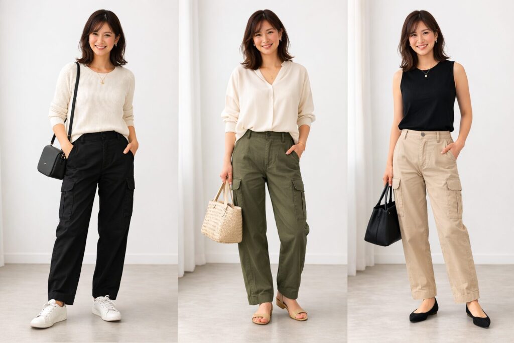 たとえば黒のカーゴパンツに、アイボリーの薄手ニット、ベージュのローファー、小ぶりのショルダーバッグを合わせると、気負いすぎず上品なバランスにまとまります。