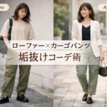 右は細身寄りで落ち感のあるカーゴパンツにローファーを合わせたすっきり上品な印象