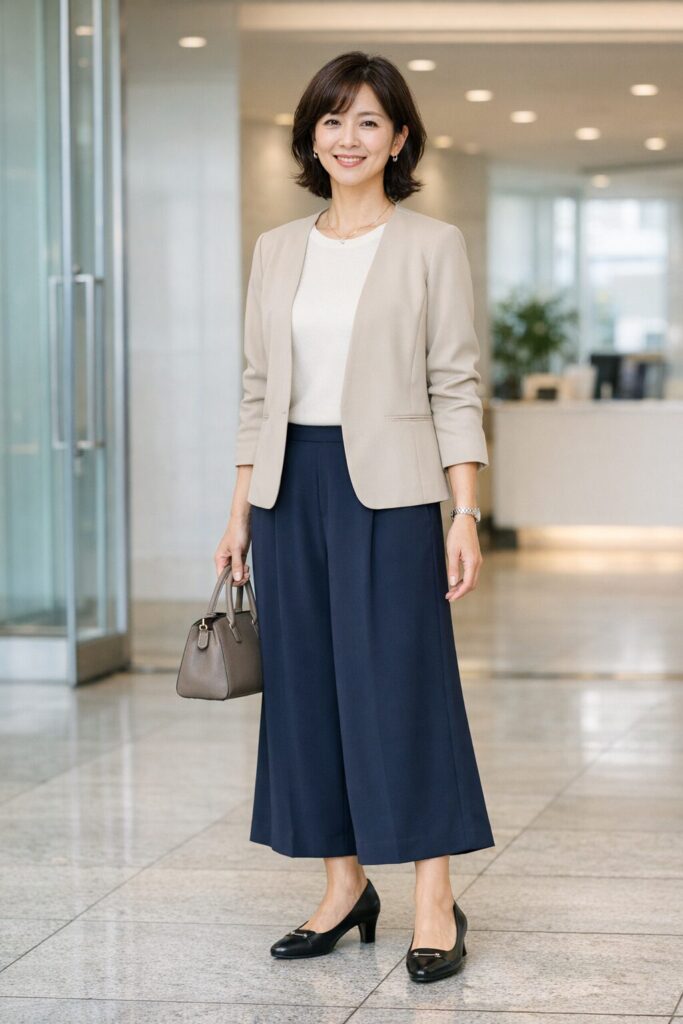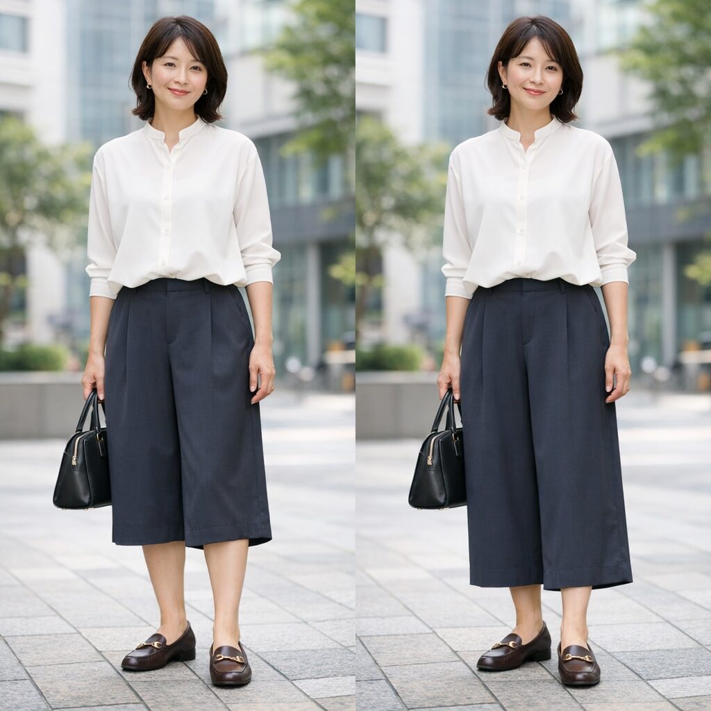ガウチョはもともと裾に広がりがあるので、丈まで中途半端だと、通勤服としては少し幼く見えることもあります。