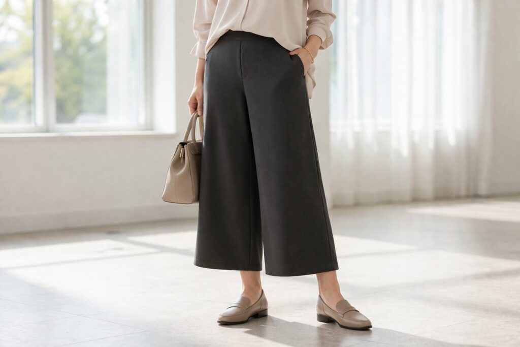 丈が整うと、ガウチョパンツはきちんと感のある通勤服として使いやすくなります。短さより、どこで裾が止まり、どう落ちるかを見て選ぶのが近道です。