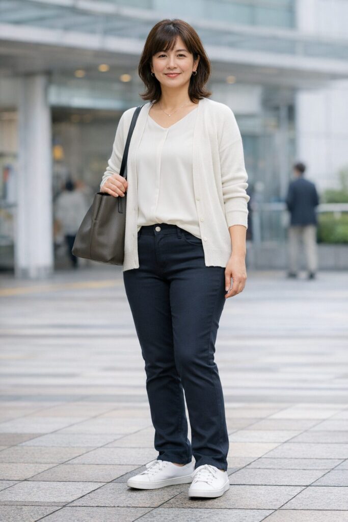 スキニーを履くときは、トップスで隠すことだけを考えすぎないほうが、全身のバランスは整いやすいです。たとえば、落ち感のあるアイボリーブラウスや、薄手のハイゲージニットなら、お腹まわりをふんわりぼかしながらも重たくなりにくいです。