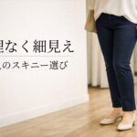 迷ったときは、まず「脚を細く見せる」より「全身がすっきり見える」かで考えるのがおすすめです。大人女性が選びやすいのは、細身でもぴたぴたに見えず、表面がなめらかで、足元に軽さが出るスキニーパンツです。