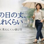 特に、きれいめに見せたい方、通勤でも使いやすくしたい方、下半身をすっきり見せたい方には、この丈感が合わせやすいと思います。長すぎると水を吸いやすく、逆に短すぎると足元だけ軽く浮いて見えることもあるので、雨の日は「ぬれにくさ」と「見た目の整いやすさ」の両方で考えるのがポイントです。