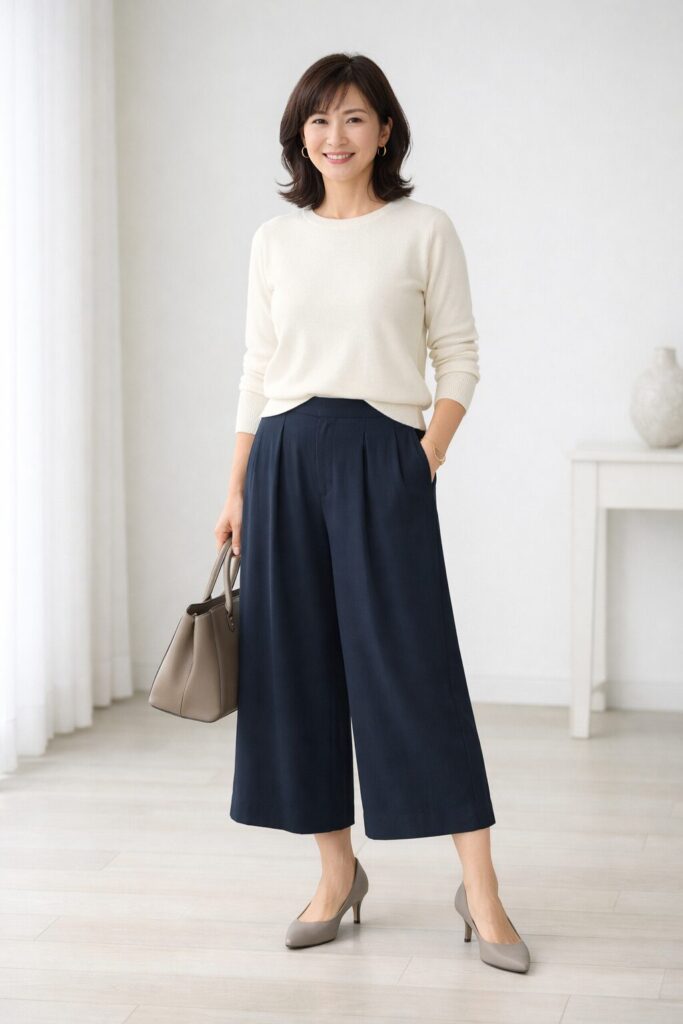 タック入りガウチョをすっきり見せたいときは、トップスの丈感も大事です。長めトップスをそのままかぶせると、お腹まわりを隠しているように見えやすく、全身が重たく見えることがあります。