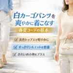 白カーゴパンツを春夏に爽やかに着るには、すっきりしたシルエットを選び、淡色中心で軽やかにまとめることが基本です。さらに、靴と小物をきれいめに整えると、カジュアルすぎず大人女性らしい清潔感のある着こなしに仕上がります。
