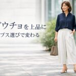 きれいめに見せやすいのは、落ち感のあるブラウス、薄手のハイゲージニット、ややハリのあるコンパクトTシャツ、比翼仕立てのシャツなどです。