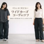 ワイドカーゴパンツをはくと、なんとなく部屋着っぽく見えたり、全体がゆるく見えたりして悩むことはありませんか。結論からいうと、だらしなく見える原因は「パンツのボリューム」「トップスとのバランス」「足元と小物の軽さ不足」にあることが多く、この3点を整えると大人女性でもすっきり着こなしやすくなります。