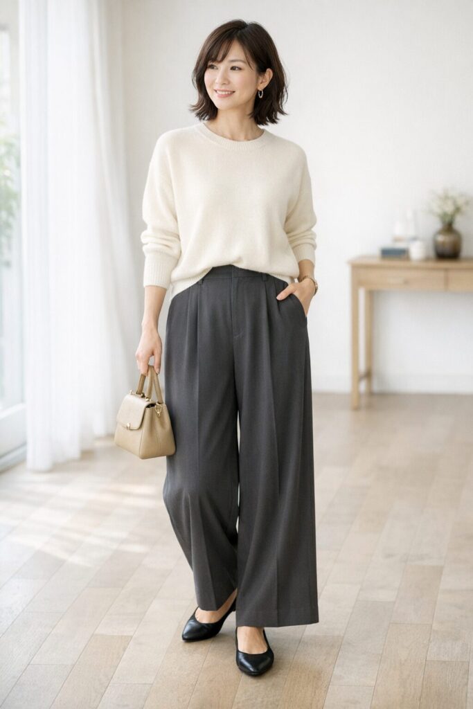 たとえば、ベージュやチャコールのワイドパンツに、やや短めの白ニット、足元はグレージュのポインテッドトゥパンプスという組み合わせなら、やわらかく上品にまとまりやすいです。