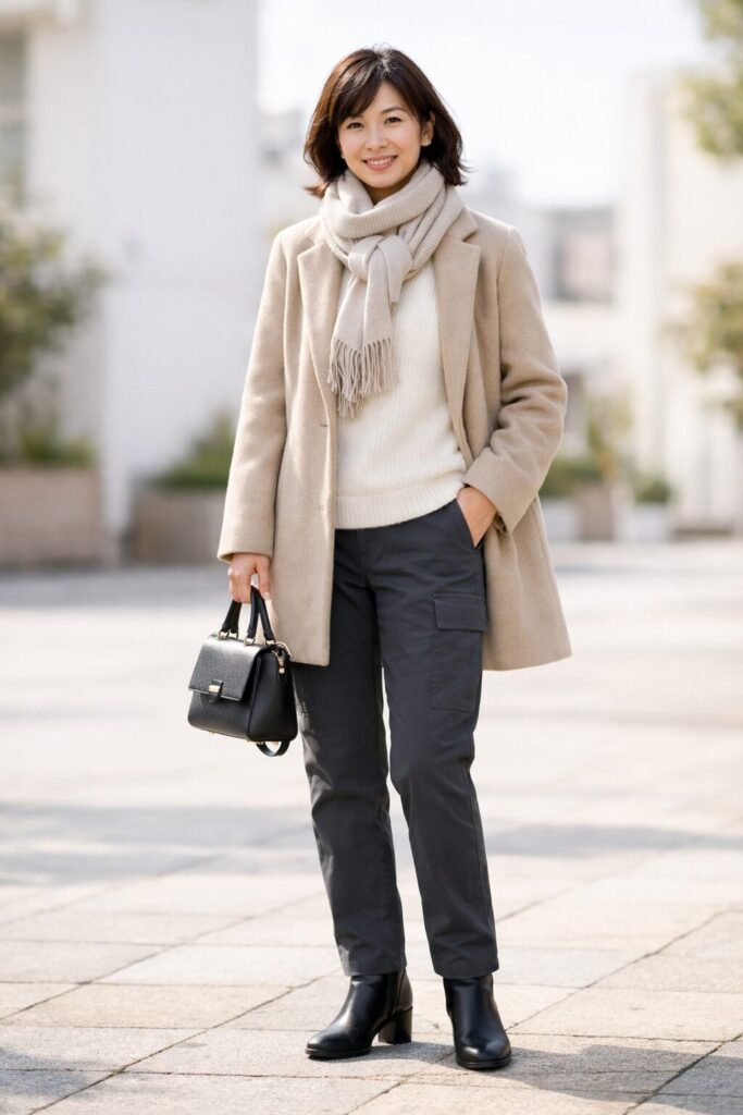 チャコールのすっきりしたカーゴパンツ、オフホワイトのニット、ベージュのミドル丈コート、細身のショートブーツ、小さめレザーバッグ、やわらかなマフラーを合わせた上品で暖かい着こなし。