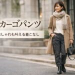 カーゴパンツはカジュアル感が強いぶん、冬は着ぶくれして見えやすいアイテムです。だからこそ、パンツそのものの選び方と、合わせる服の重さの調整がとても大切。少し意識するだけで、大人女性らしい落ち着いた着こなしにまとまります。