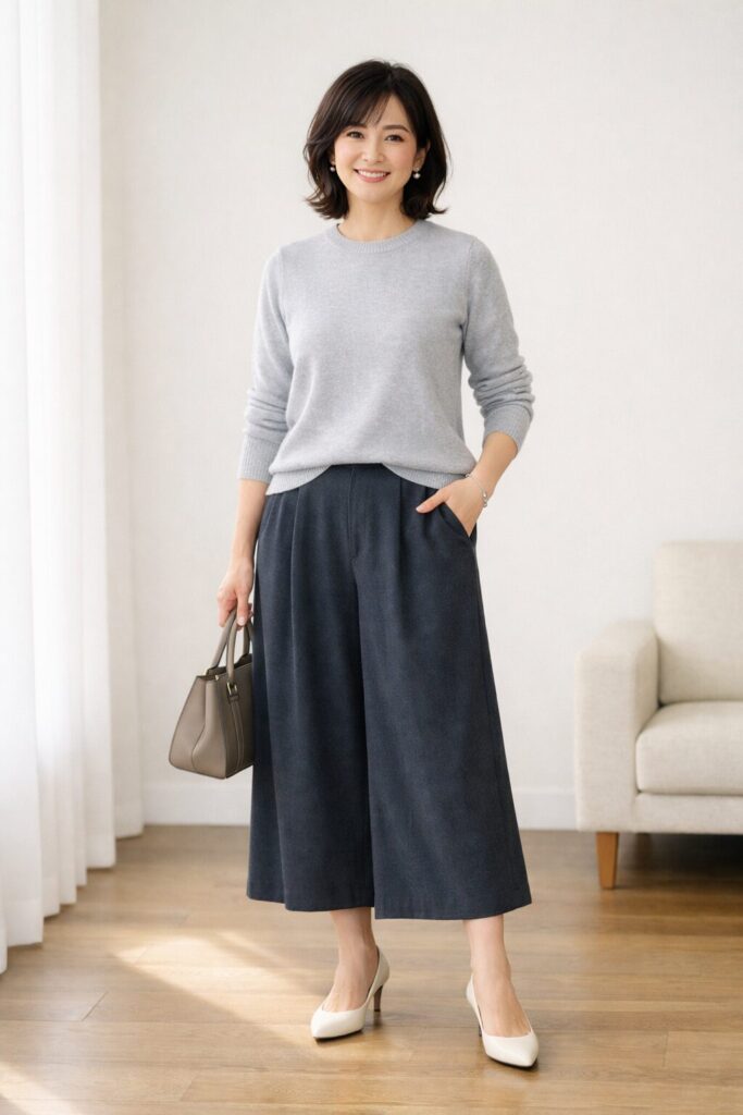 もう少し通勤寄りなら、ネイビーのガウチョにオフホワイトのバンドカラーシャツを重ね、上からライトグレーの短めニット、足元は黒の細身ヒールローファーも合わせやすいです。
